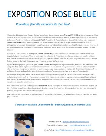 À l’occasion d’Octobre Rose, la Ville de Bondues accueille l’artiste-peintre Thomas VAN HECKE, actif sur la scène artistique contemporaine, reconnu pour ses aplats de bleu intense, ses lignes claires et l’absence assumée d’expressivité dans son œuvre.